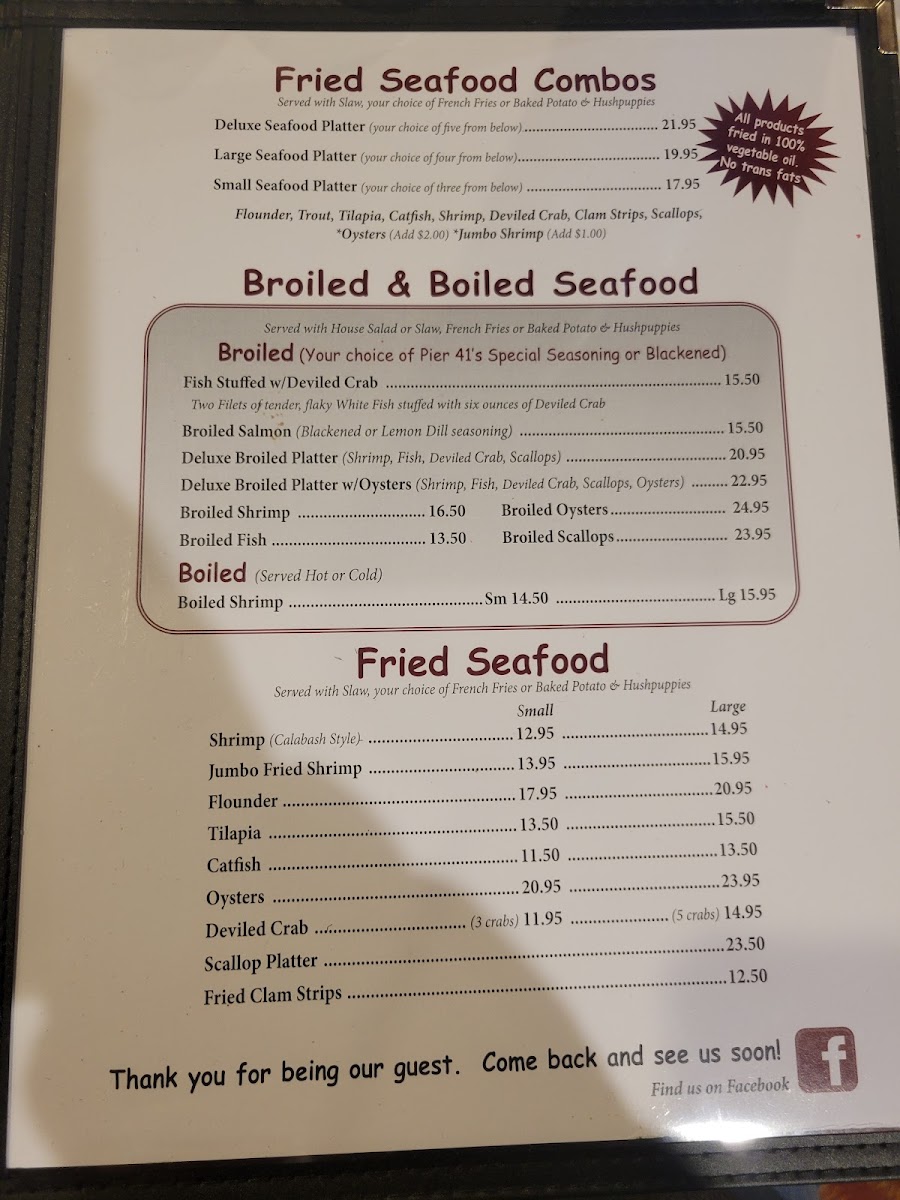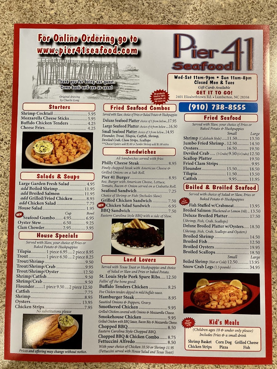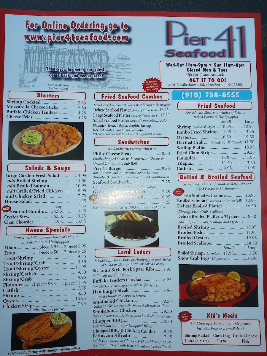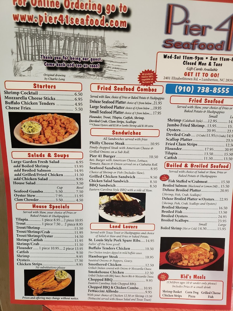 Located at 2401 E Elizabethtown Rd, Lumberton, NC, Pier 41 Seafood Menu offers a delightful variety of freshly prepared seafood dishes that capture the essence of coastal dining. From perfectly seasoned shrimp and crab cakes to mouthwatering fish fillets, each dish is crafted to bring out the natural flavors of the ocean. The menu features a mix of light appetizers and hearty entrees, catering to all tastes and preferences. Whether you're in the mood for a classic seafood boil or a flavorful grilled platter, there's something on the menu for everyone. The warm, inviting atmosphere makes it a perfect spot for a relaxed meal with family and friends.