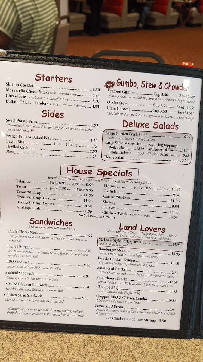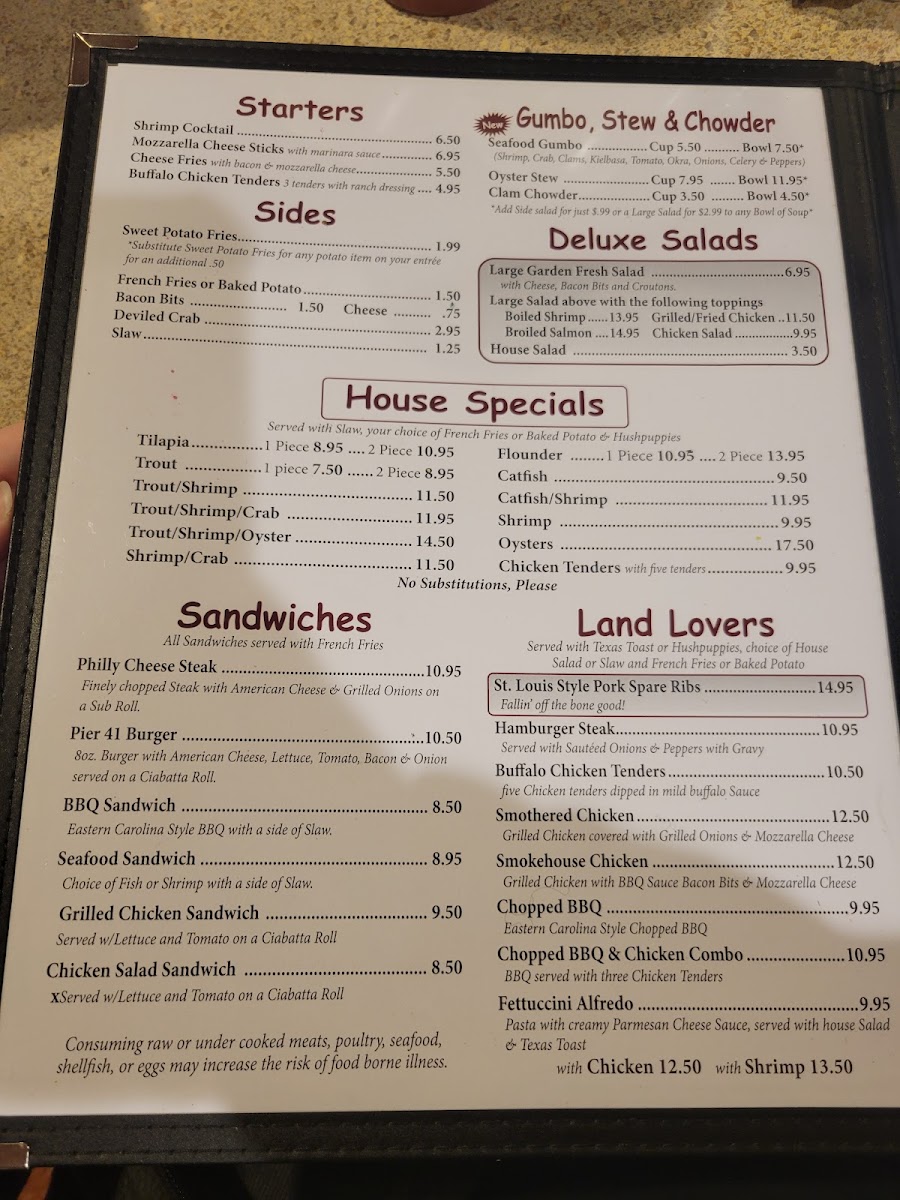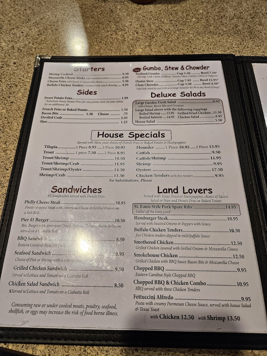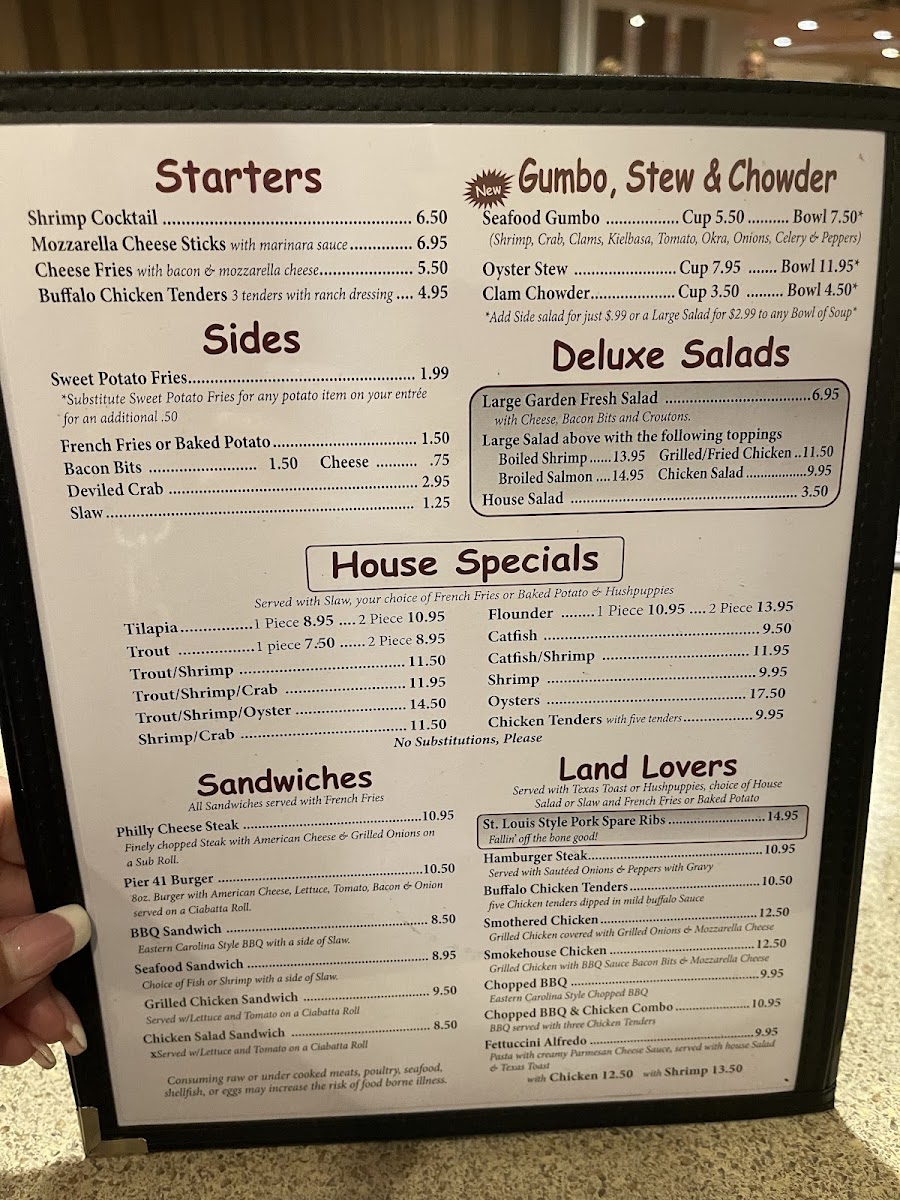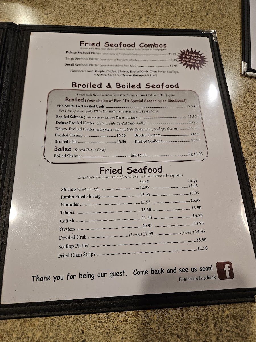 Located at 2401 E Elizabethtown Rd, Lumberton, NC, Pier 41 Seafood Menu offers a delightful variety of freshly prepared seafood dishes that capture the essence of coastal dining. From perfectly seasoned shrimp and crab cakes to mouthwatering fish fillets, each dish is crafted to bring out the natural flavors of the ocean. The menu features a mix of light appetizers and hearty entrees, catering to all tastes and preferences. Whether you're in the mood for a classic seafood boil or a flavorful grilled platter, there's something on the menu for everyone. The warm, inviting atmosphere makes it a perfect spot for a relaxed meal with family and friends.